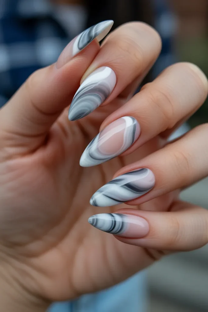 Marble stiletto nails give a chic, sophisticated vibe with swirling patterns that mimic real marble. Neutral tones or bold colors can be used for a high-end, elegant look. These nails are perfect for those who love artistic and classy designs.