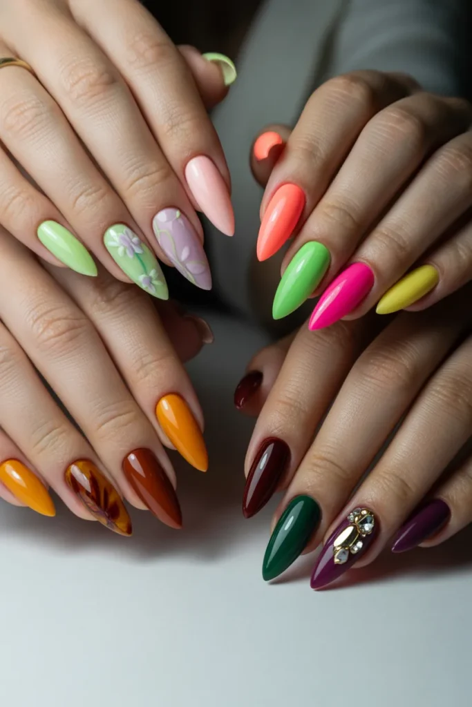 Seasonal stiletto nails match the colors and vibes of each season. Think pastels for spring, vibrant neons for summer, earthy tones for fall, and deep hues for winter. Seasonal nails let you express your style year-round while staying trendy. You can combine seasonal colors with glitter, ombre, or simple designs for a fresh look.