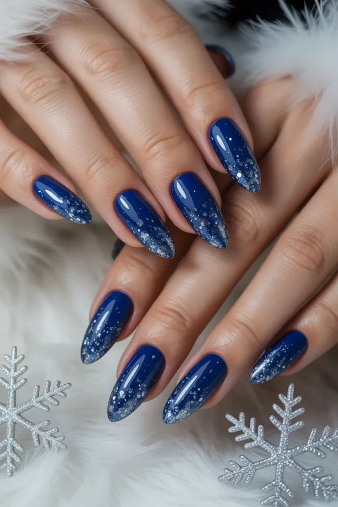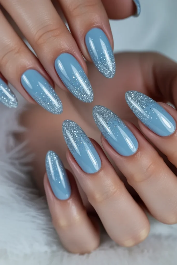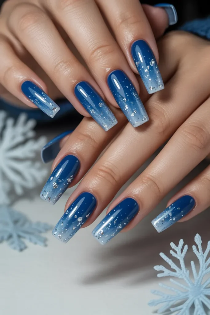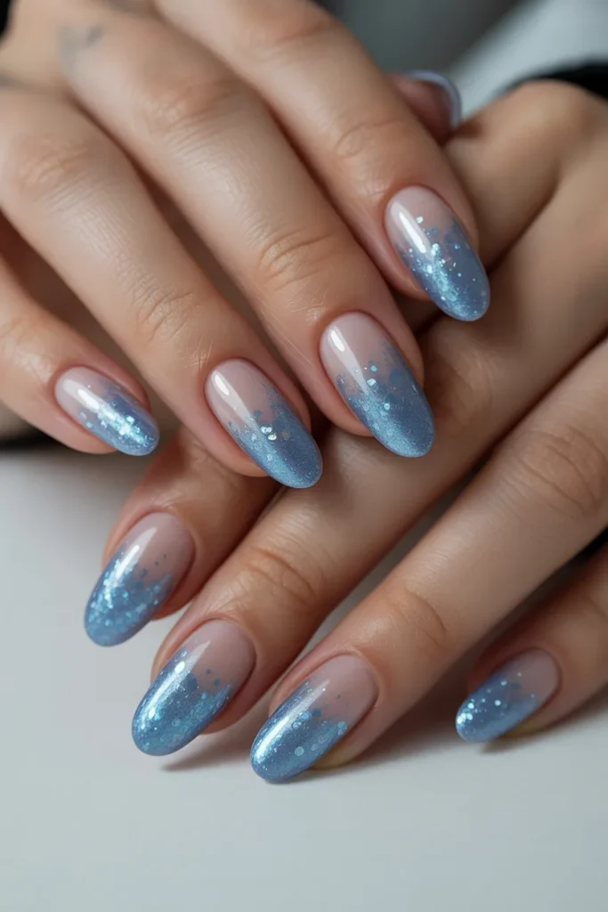 Gradient from soft blue to deep navy with glitter adds depth and winter sparkle.