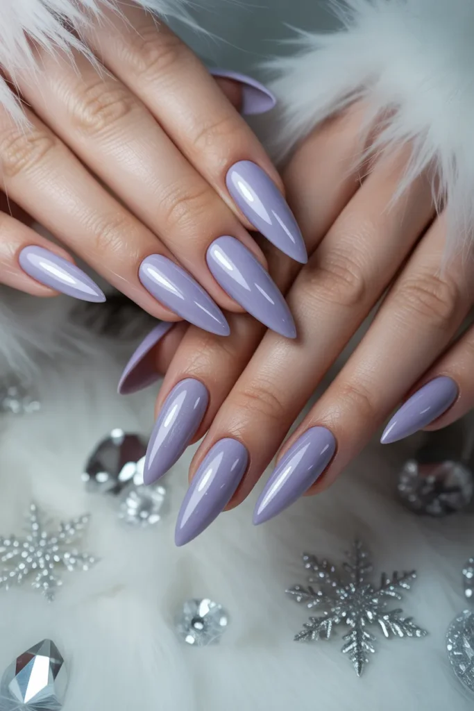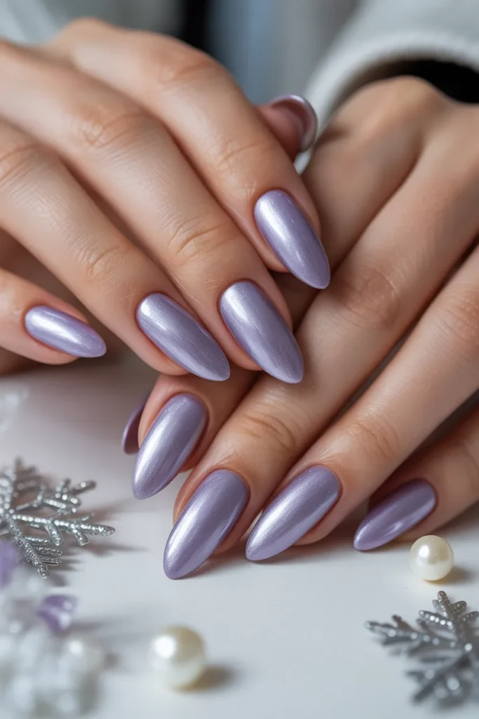 Soft lavender with frosted shimmer creates a delicate and calming winter aesthetic.