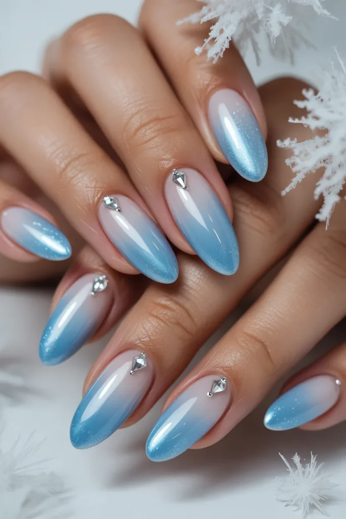 White to pale blue ombre nails with tiny diamond accents for luxury.
