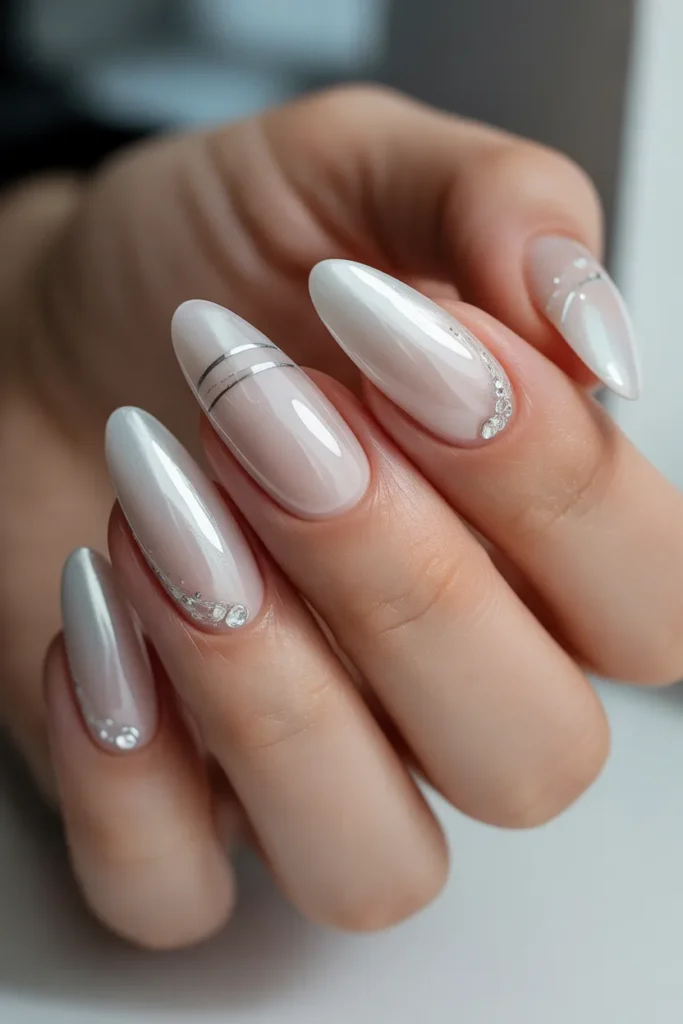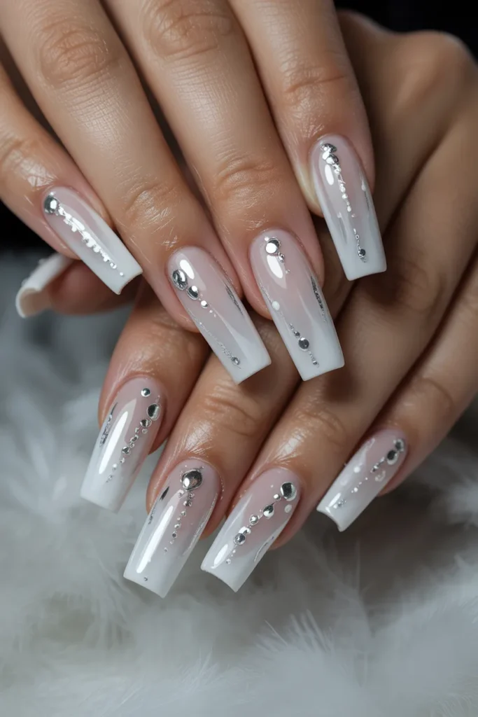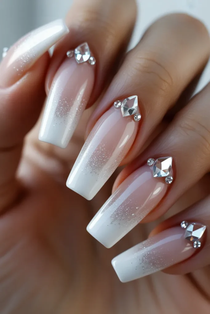 White ombre nails with tiny diamond accents create glamorous, frosty nails.
