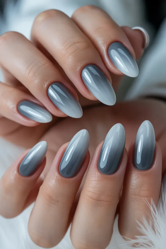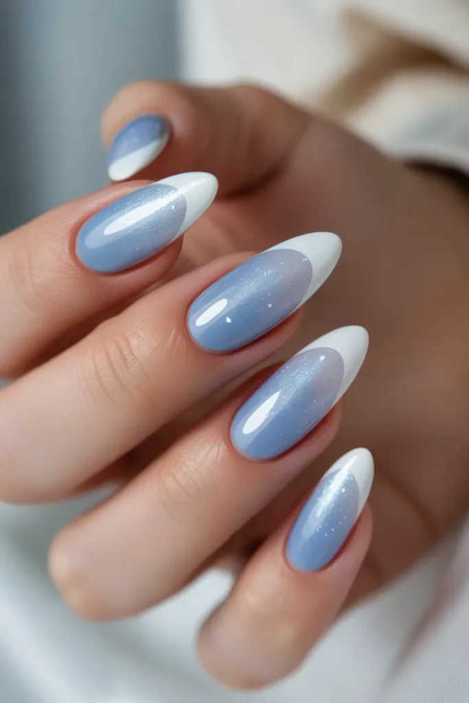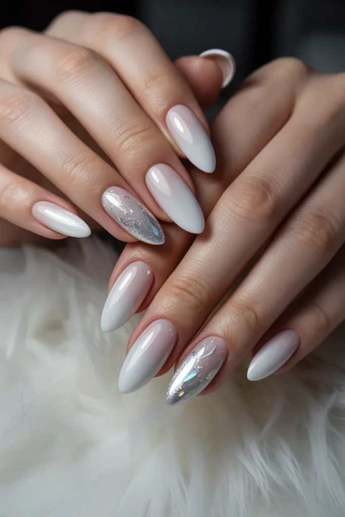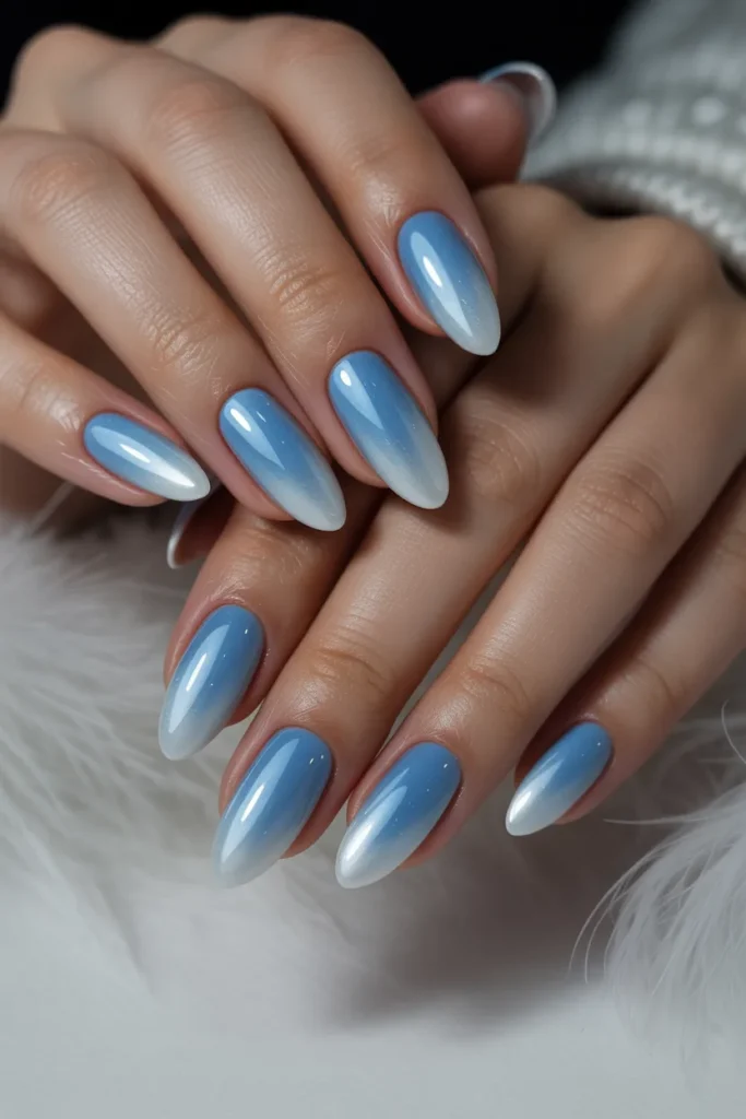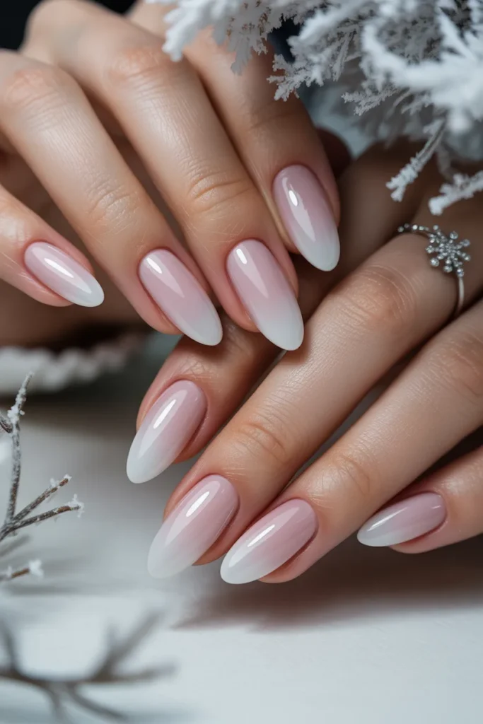 Soft gradient nails with frosty shimmer create an ethereal winter look.