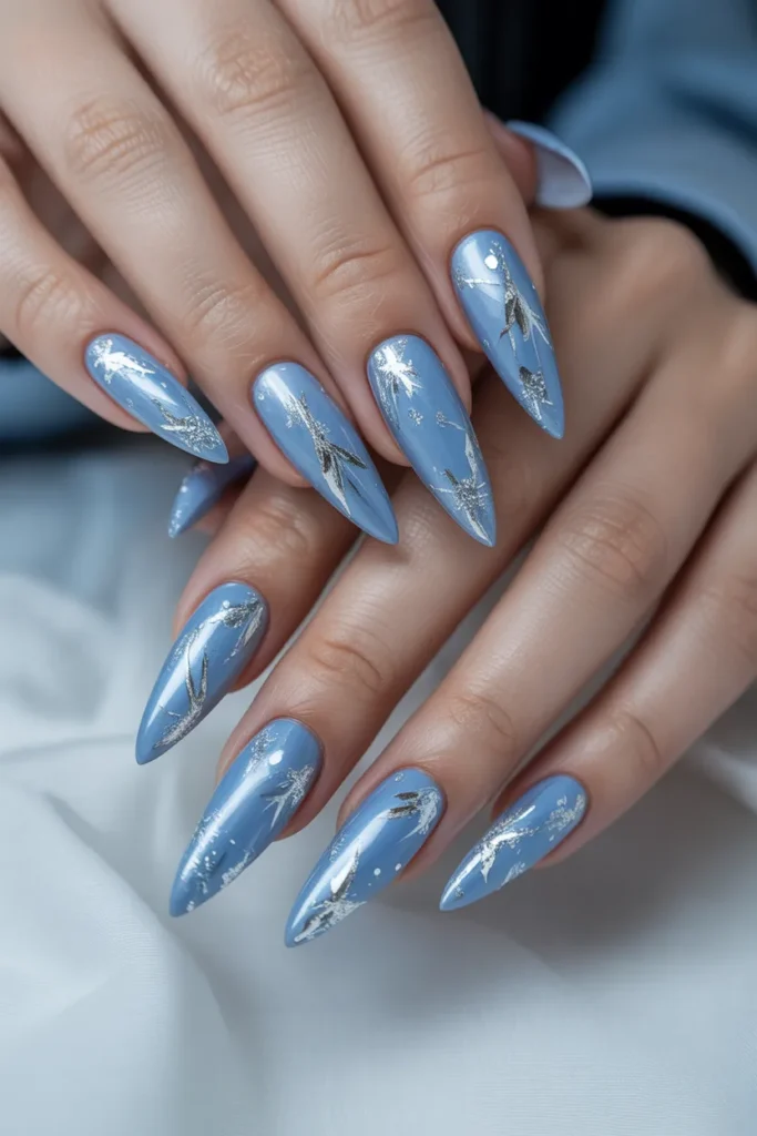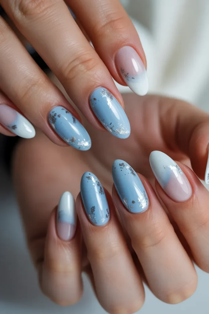 Silver foil accents on icy-colored nails create a luxurious winter vibe.