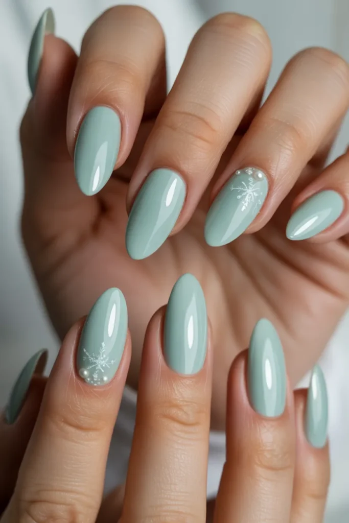 Pastel mint under a glossy finish gives a refreshing winter vibe.