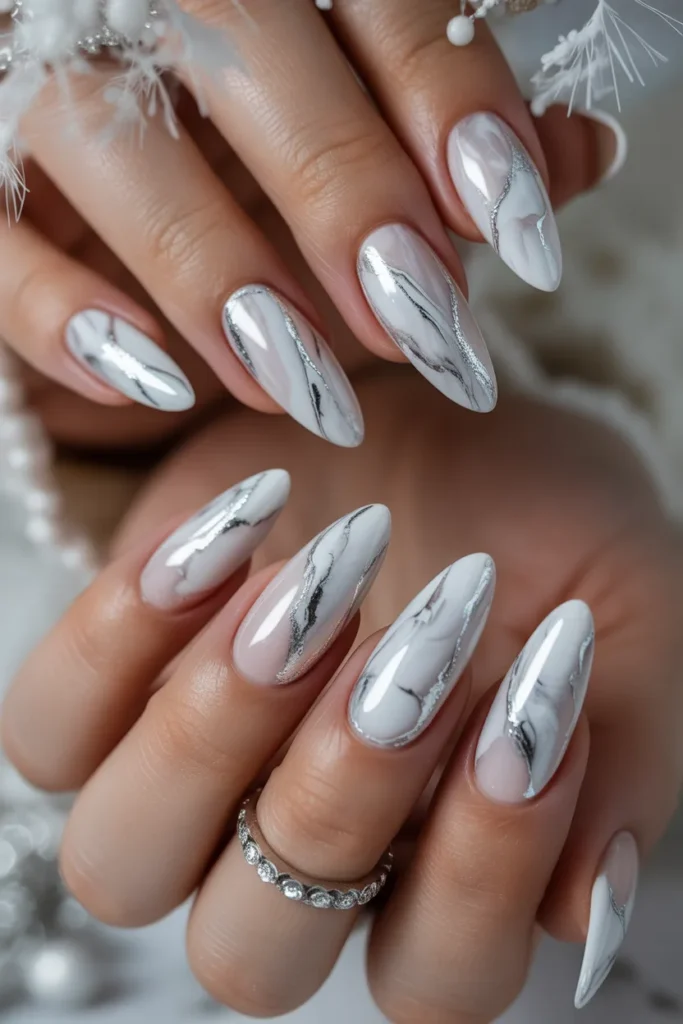 Marble patterns in white and silver give a sophisticated frosty look. Perfect for chic winter nails.