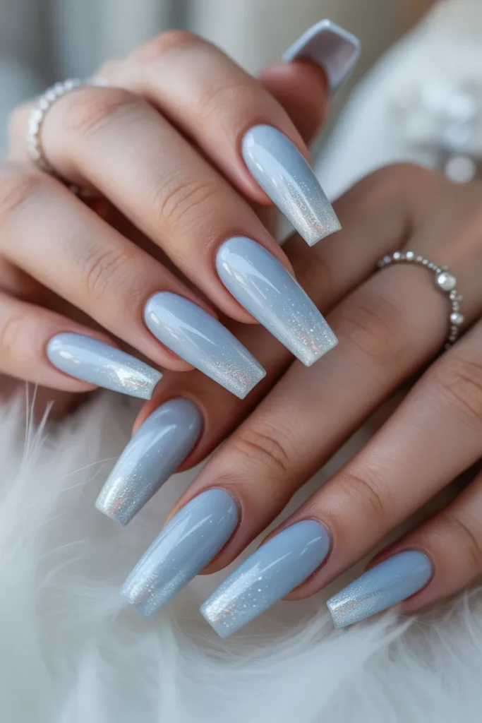A blend of soft blue and silver glitter gives a magical, frosty sparkle effect.