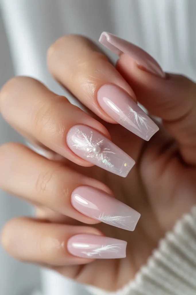 Soft pink fading into white with a glossy finish adds a feminine winter vibe.