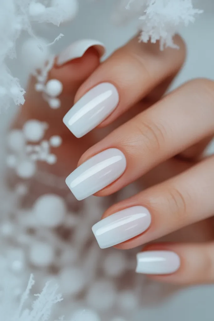 Pure white nails with glossy shine for a clean, modern winter vibe. Perfect for minimalist elegance.