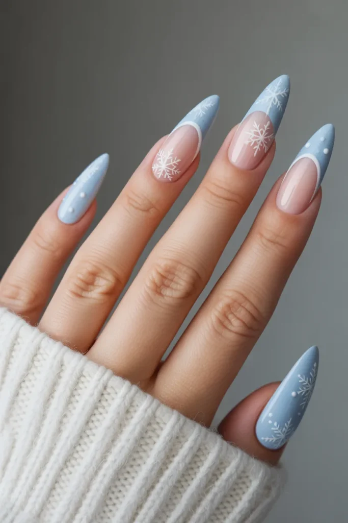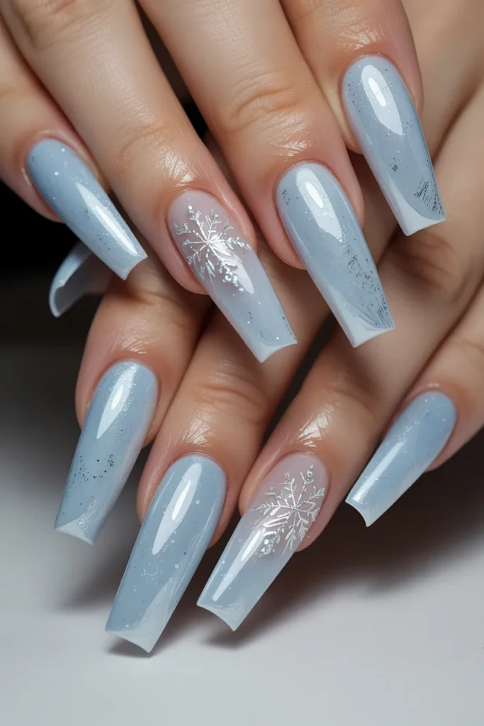 Combine glitter and snowflake accents on icy nails for festive winter flair.