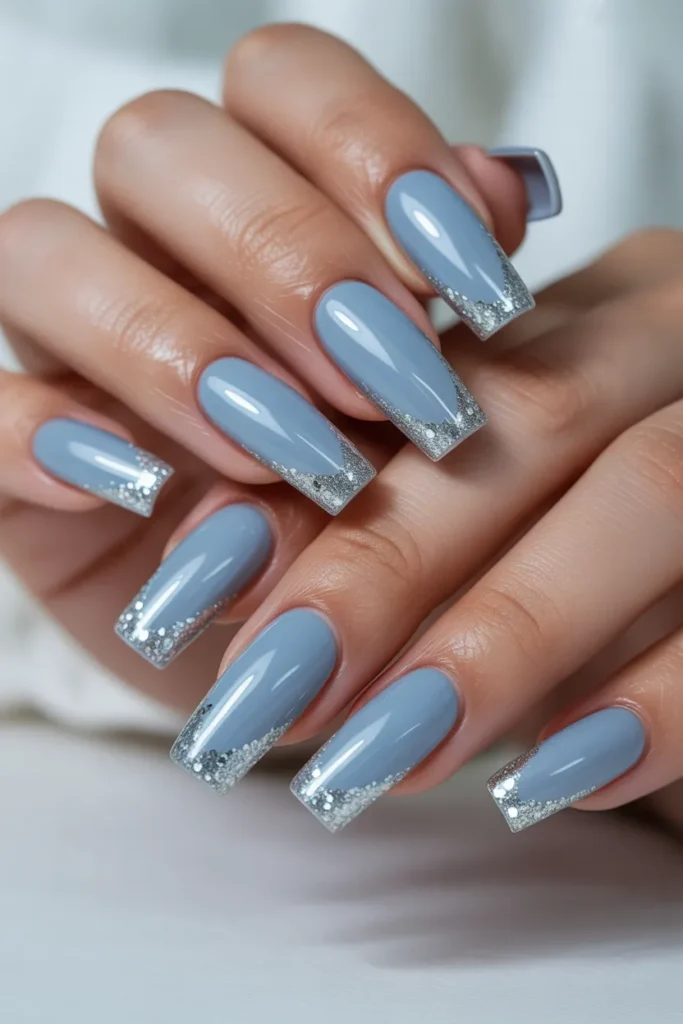 Silver glitter on pale blue or white nails creates a sparkling frosty effect perfect for the holidays.