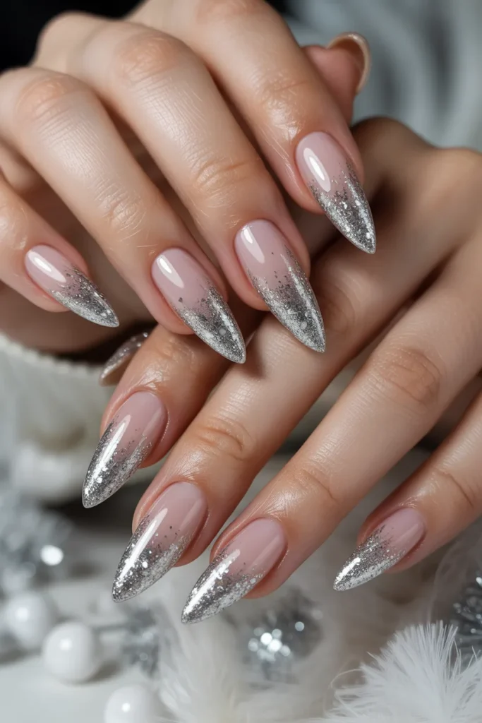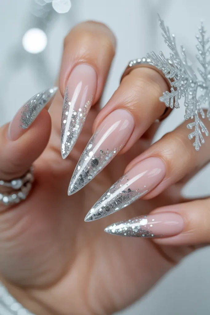 Silver glitter fading into clear or white nails gives a frosty sparkling effect.