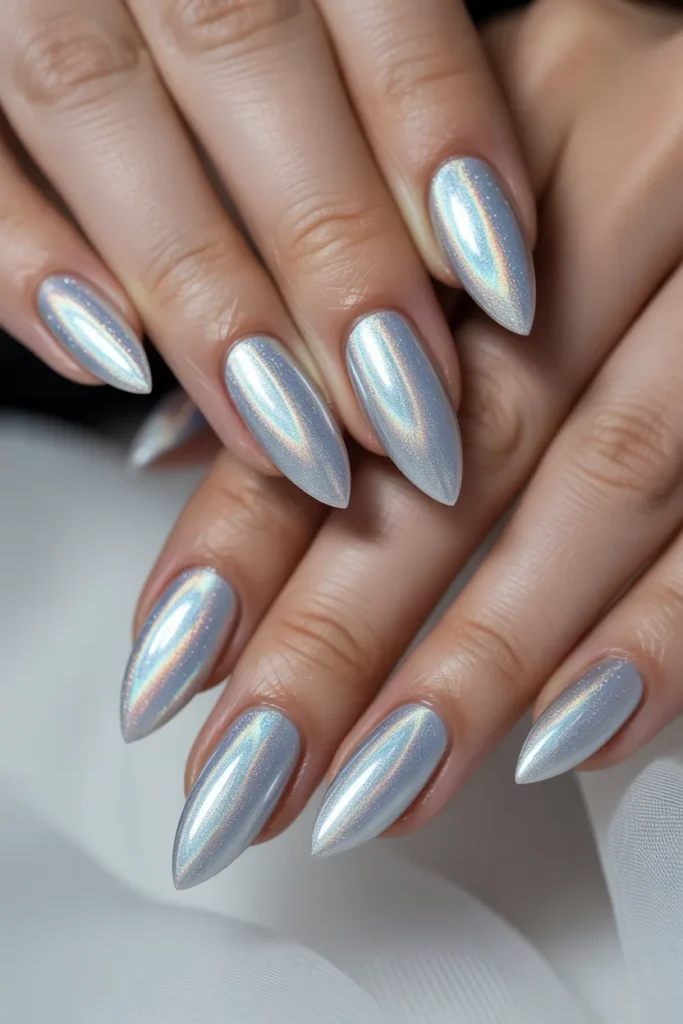 Holographic nails reflect icy shades and give a magical frozen vibe.