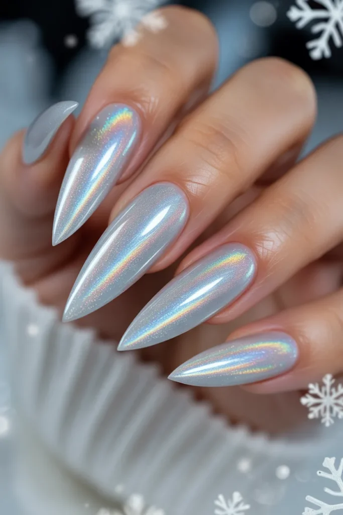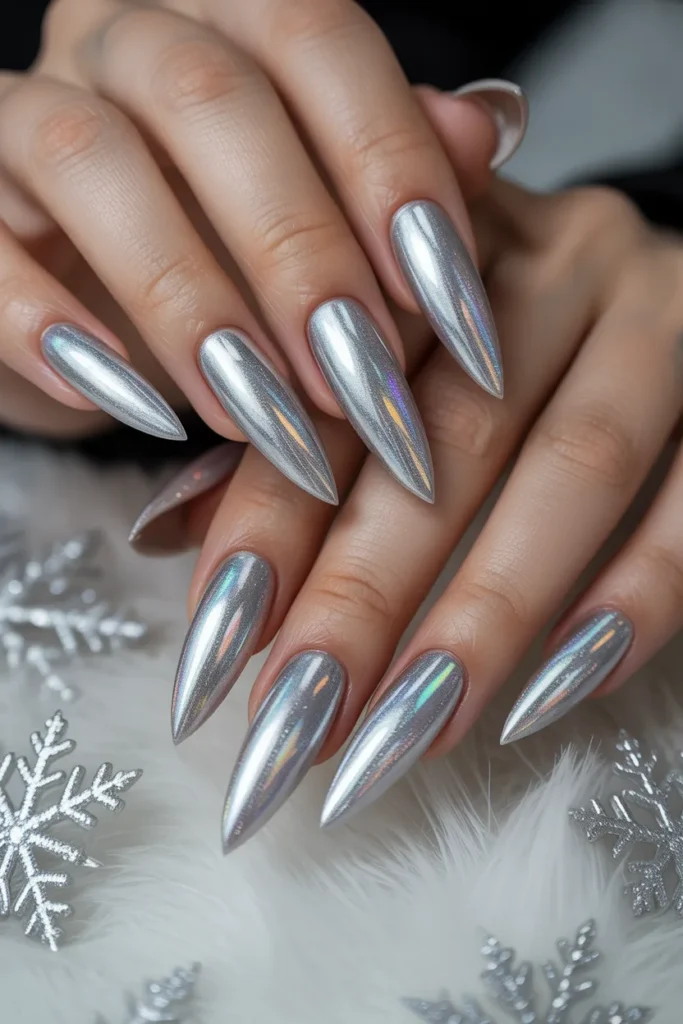 Holographic silver nails mimic icy frost with a rainbow shimmer effect. Perfect for bold winter glam.