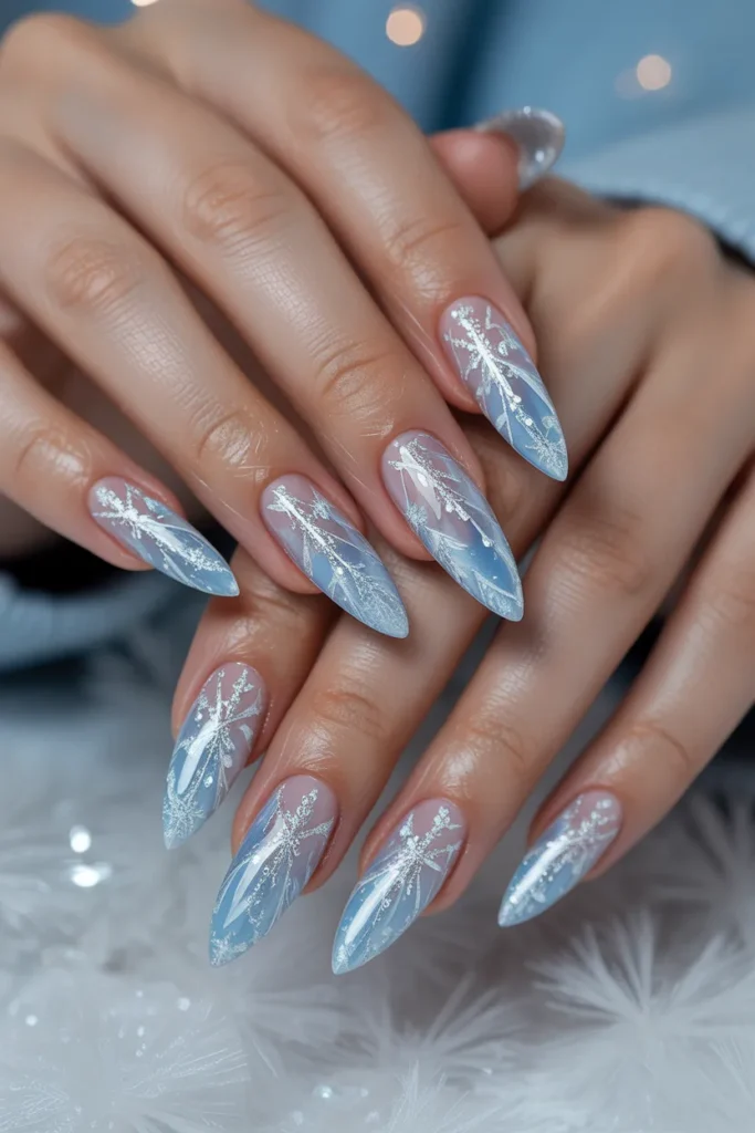 Intricate white or silver crystalline patterns over icy nails for a magical winter look.