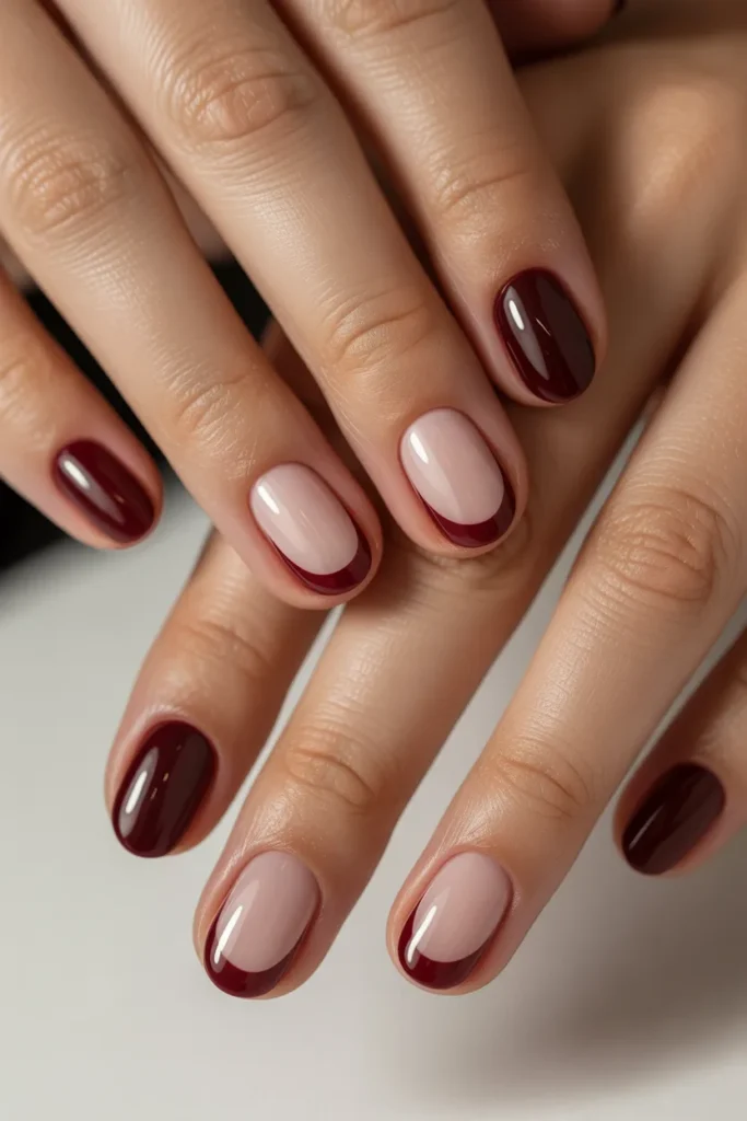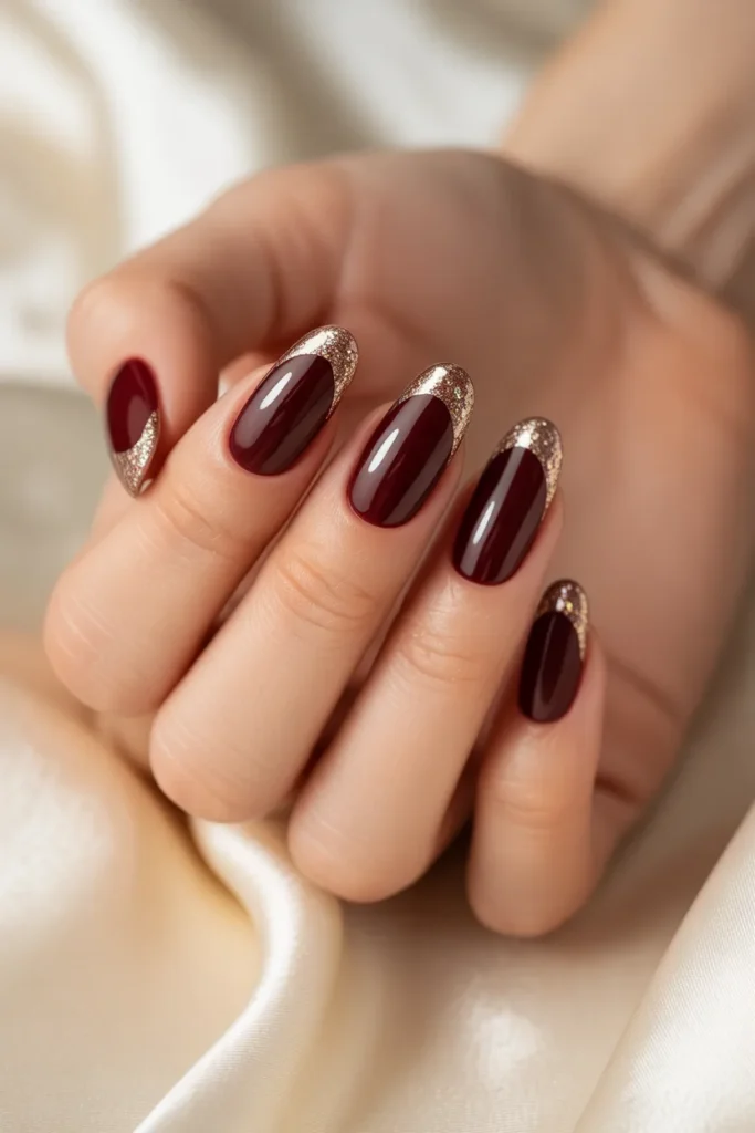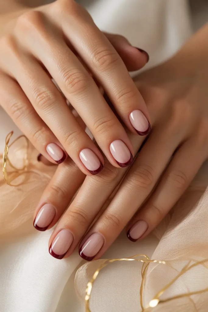 A chic twist on the classic manicure, this style incorporates half-moon shapes at the base of the nails in nude, gold, or metallic shades. It adds a sophisticated contrast against the rich burgundy, giving a modern, minimalist vibe. Ideal for those who love stylish yet understated nail art.