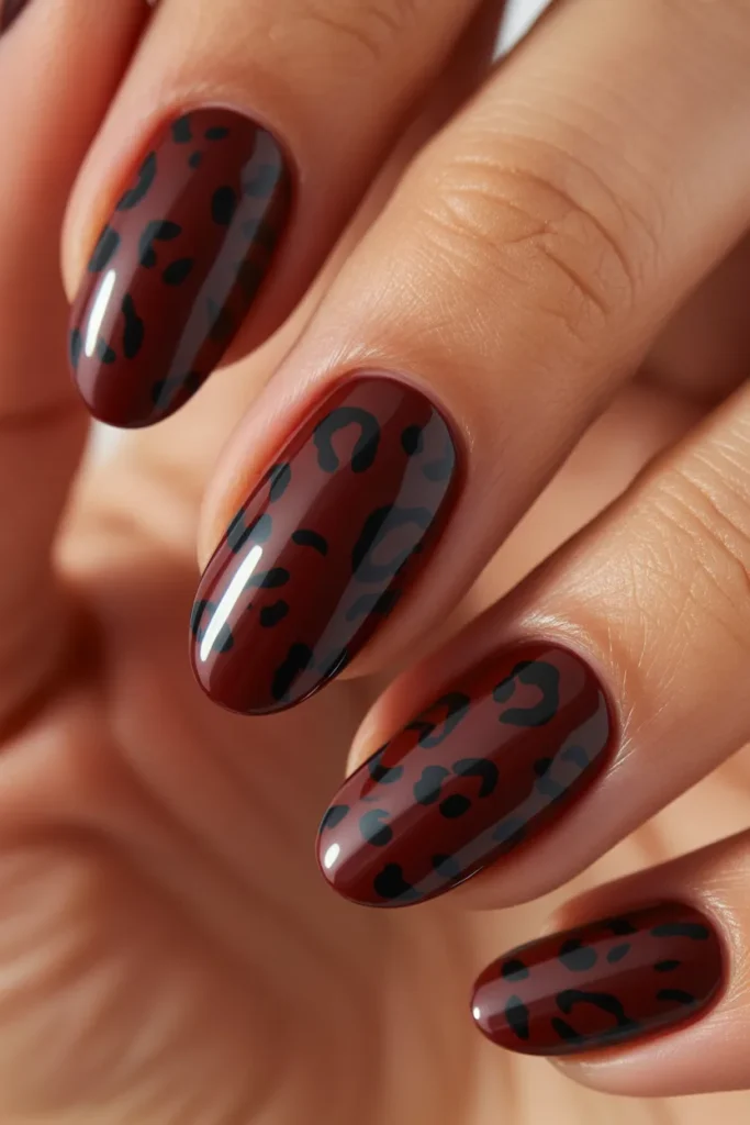 Burgundy leopard print nails add a playful and fierce touch to your manicure. Black or dark brown spots are carefully placed over a burgundy base, creating a bold and trendy look. This design is perfect for making a statement while maintaining elegance, and it works well on both long and short nails. It’s fun, stylish, and utterly captivating.