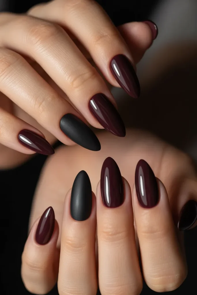 Alternate between glossy burgundy and matte black nails for a bold, edgy look. The contrast between the deep red and muted black creates a striking, contemporary aesthetic. This style works well for those who want a modern and versatile manicure.