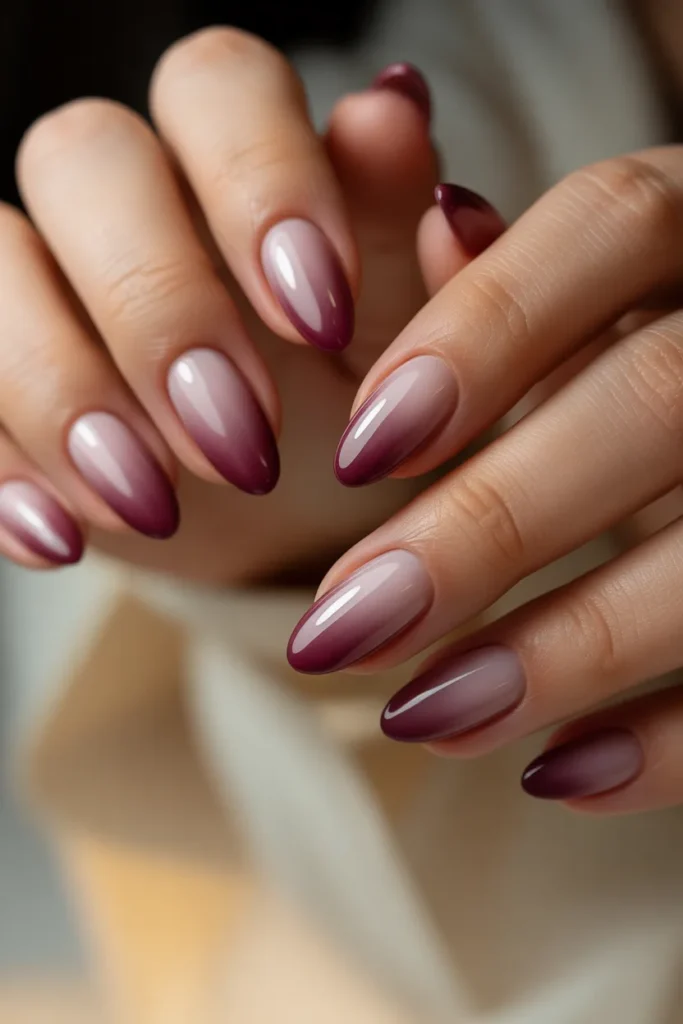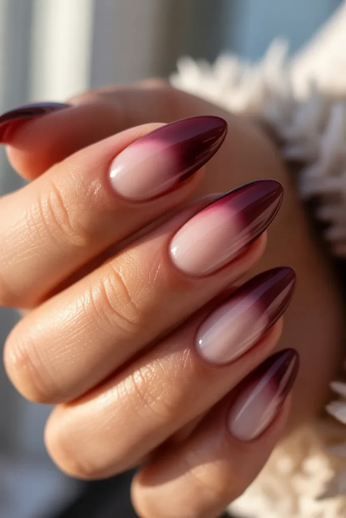 A gradient from nude to burgundy nails adds a soft, romantic touch to your manicure. The smooth transition blends light and dark tones beautifully, creating depth and dimension on each nail. This design is versatile enough for everyday wear or special events and highlights the elegance of burgundy without being overpowering.