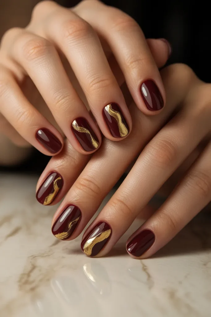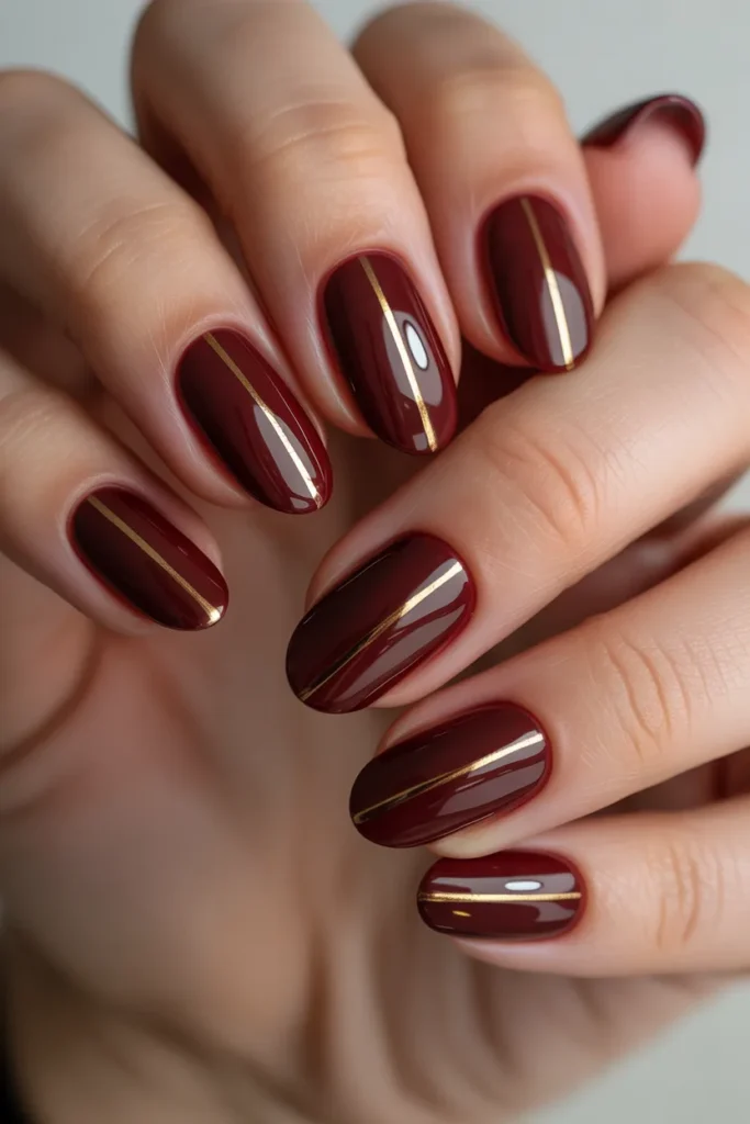 Burgundy nails paired with subtle gold accents exude glamour and refinement. You can add a thin gold stripe, glitter line, or geometric design on one or two nails to create a striking contrast. This combination is perfect for special occasions or when you want your manicure to feel extra luxurious. The gold detail instantly elevates the deep burgundy shade.