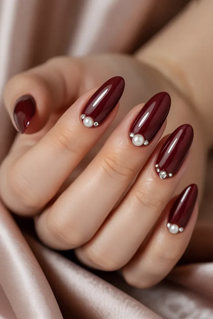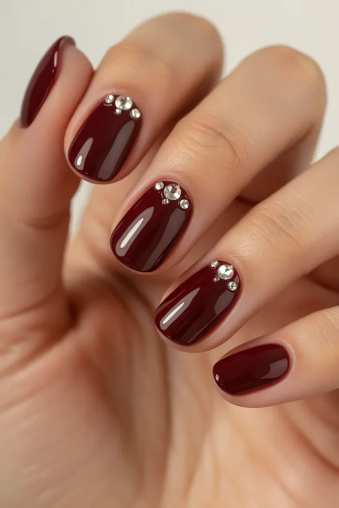 Tiny gemstones or rhinestones are delicately placed over a burgundy base, creating sparkle and elegance. Accent nails can feature clusters of gems for a dramatic effect. This design is perfect for special events or when you want your manicure to truly shine.
