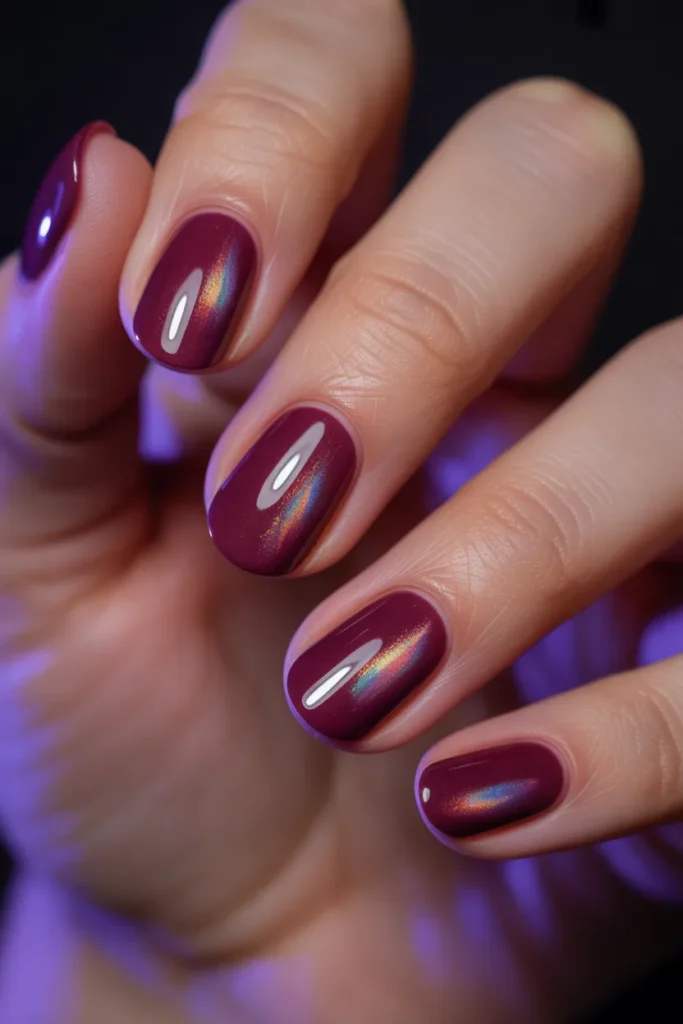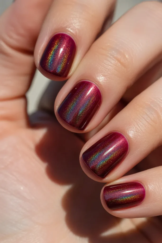 Add a dreamy, ethereal twist with an opal-like shimmer over burgundy nails. The iridescent effect creates subtle color shifts, giving a mystical and feminine vibe. Ideal for a sophisticated yet playful manicure that captures attention.