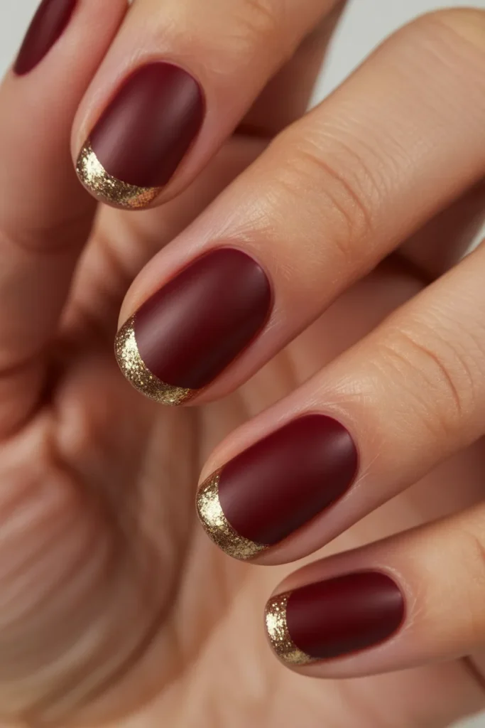 Matte burgundy nails combined with sparkling glitter tips are perfect for nights out or festive occasions. The matte base creates a soft, velvety finish, while glitter adds a glamorous sparkle. This design balances sophistication with fun, making your manicure elegant yet festive.