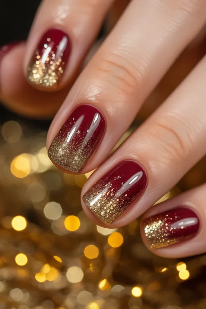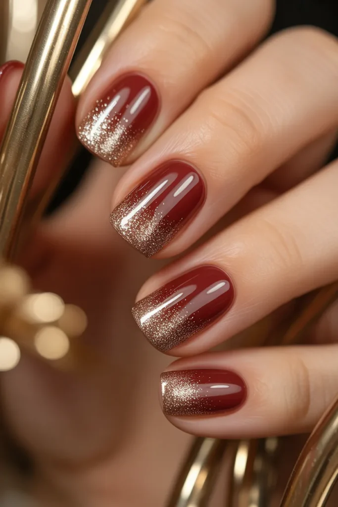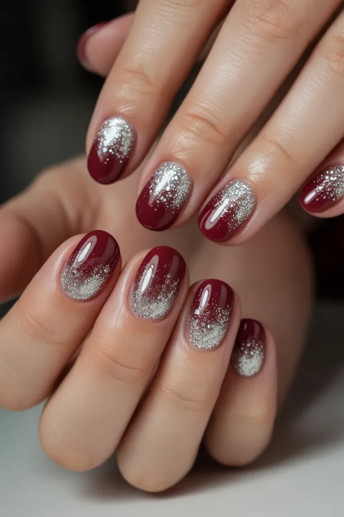 A burgundy gradient fading into glitter brings a festive and glamorous touch to your nails. The glitter adds sparkle and dimension, making your manicure perfect for parties or special events. It’s a versatile design that elevates a classic burgundy base with a fun twist.
