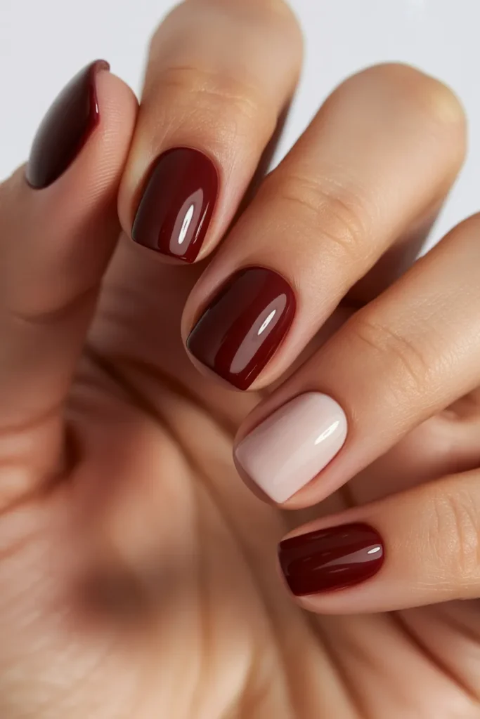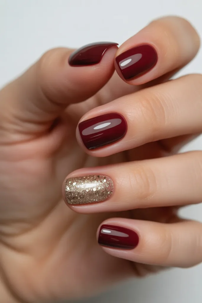 Keep most nails classic burgundy and make one nail pop with glitter. This simple accent adds sparkle and glamour without overwhelming your manicure. Perfect for special occasions or just to add a playful, stylish twist to a classic look.