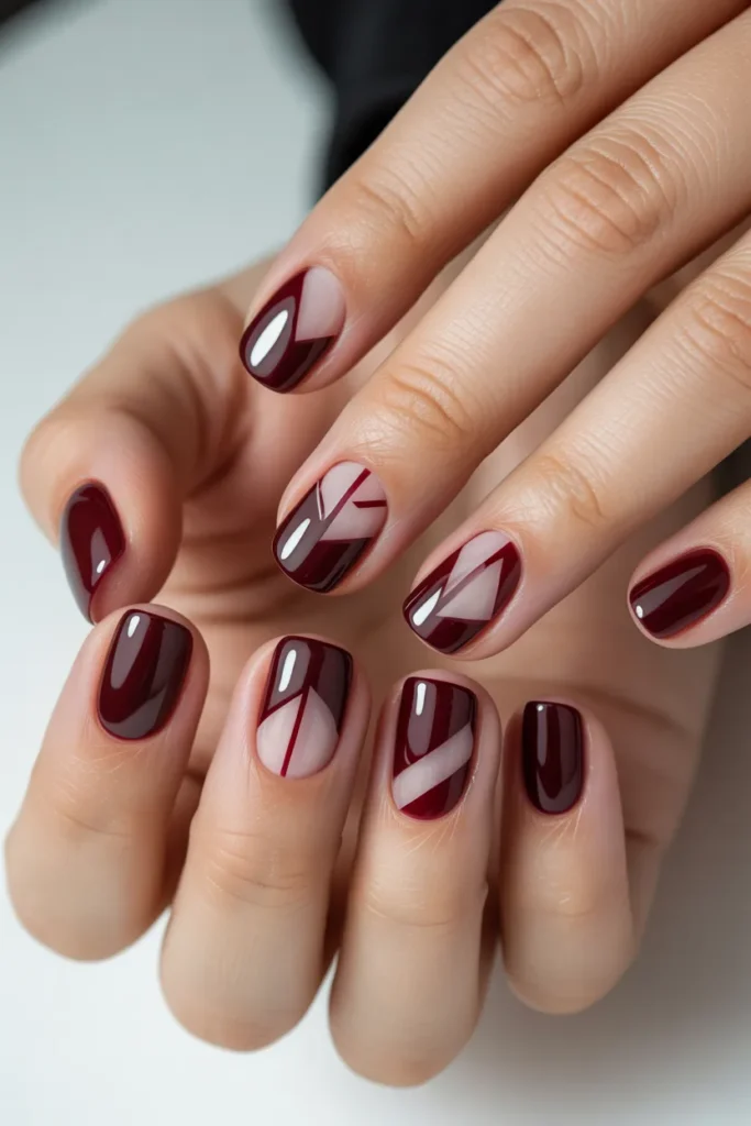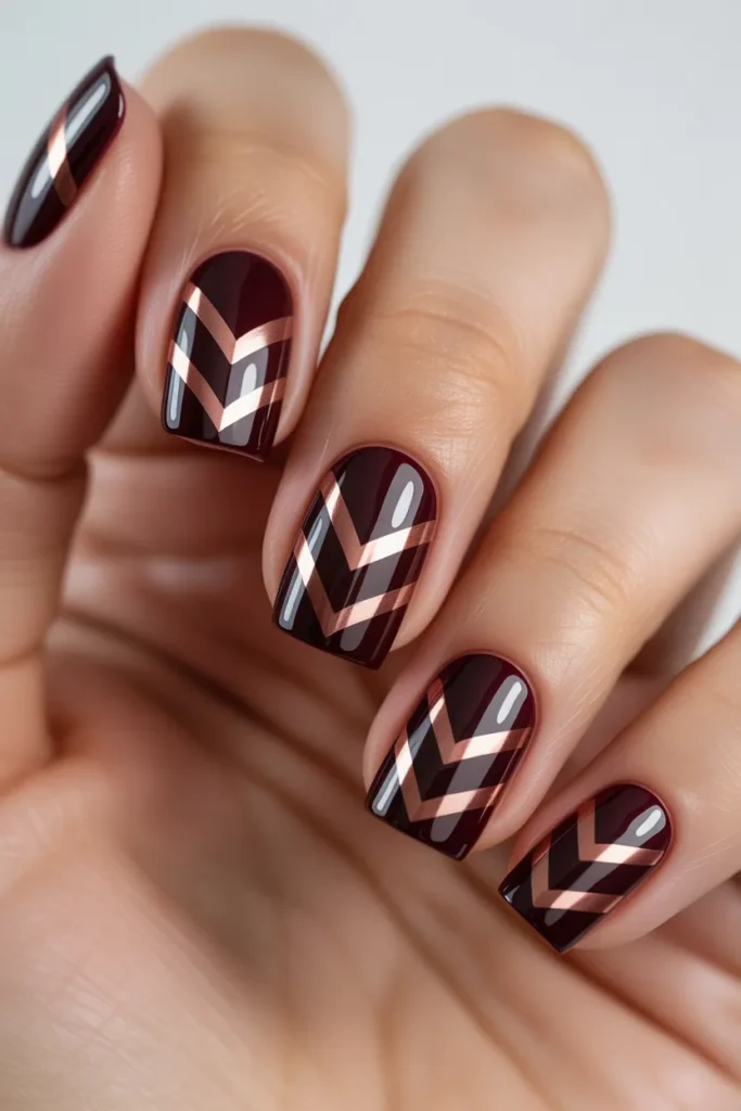 Geometric chevron patterns in metallic gold, silver, or nude stand out beautifully against burgundy nails. This design adds movement and visual interest while remaining classy and trendy. Perfect for a chic, fashion-forward manicure.
