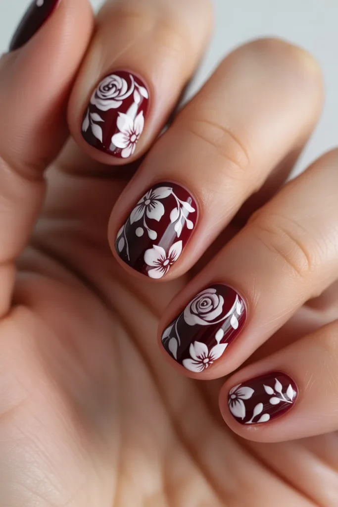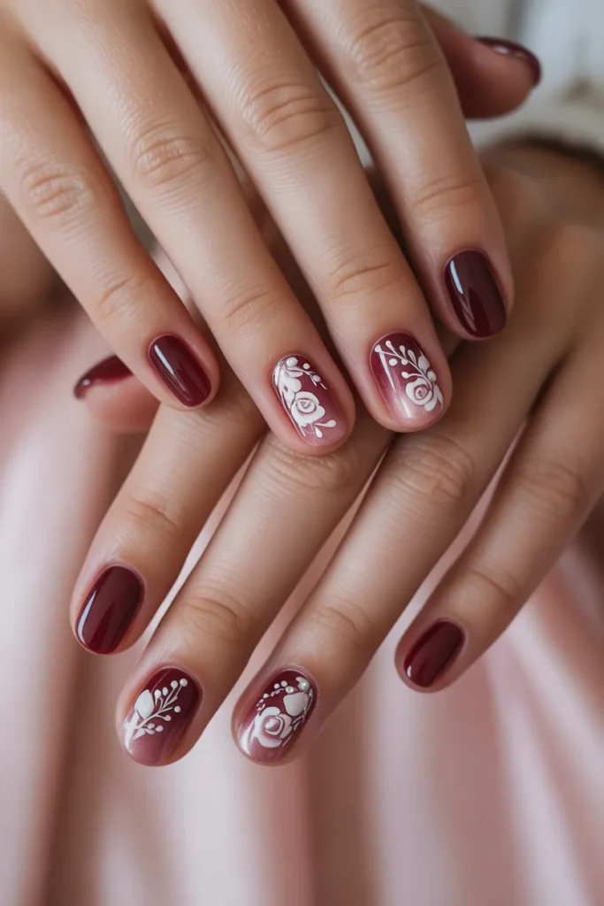 A soft ombre of burgundy shades on the nails, with delicate floral designs on accent nails, creates a romantic and feminine look. Perfect for weddings, dates, or spring-inspired manicures. The gradient adds depth, while the flowers provide intricate beauty.