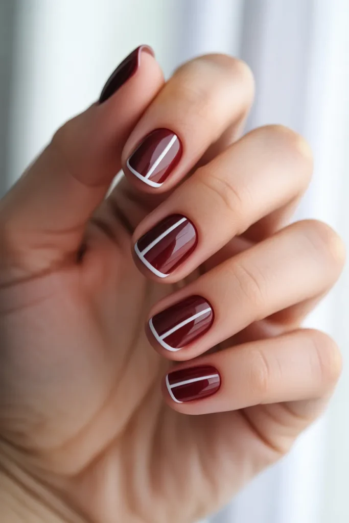 Add a graphic punch with bold white stripes over a deep burgundy base. Vertical, horizontal, or diagonal stripes can make nails look trendy and stylish while still being classy. This design is perfect for those who love a mix of simplicity and visual interest.