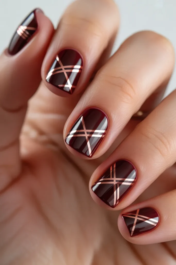 Geometric patterns in rose gold over burgundy nails create a luxurious, modern design. Triangles, lines, or abstract shapes catch the light beautifully, making your manicure stand out. Perfect for those who love artistic elegance and contemporary flair.