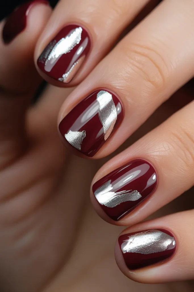 Burgundy nails paired with silver foil accents create a luxurious and modern look. The metallic foil catches the light, adding depth and dimension to your manicure. Perfect for special occasions or whenever you want to make a statement. This combination balances elegance with a touch of edginess.