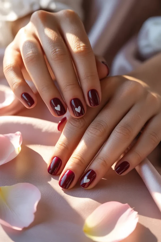 Tiny heart motifs on a burgundy base create a sweet and playful look. White or pink hearts pop beautifully against the deep shade, perfect for Valentine’s Day or romantic events. This design is fun, flirty, and adds a touch of charm to any manicure.