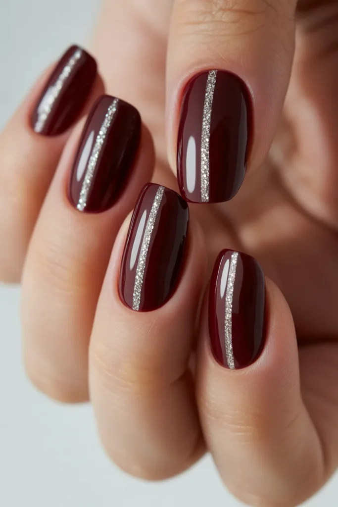 Thin vertical or diagonal glitter stripes on a burgundy base create a sophisticated yet playful effect. The glitter catches the light beautifully, making nails look polished and festive. This design is elegant enough for formal events but fun for everyday wear.