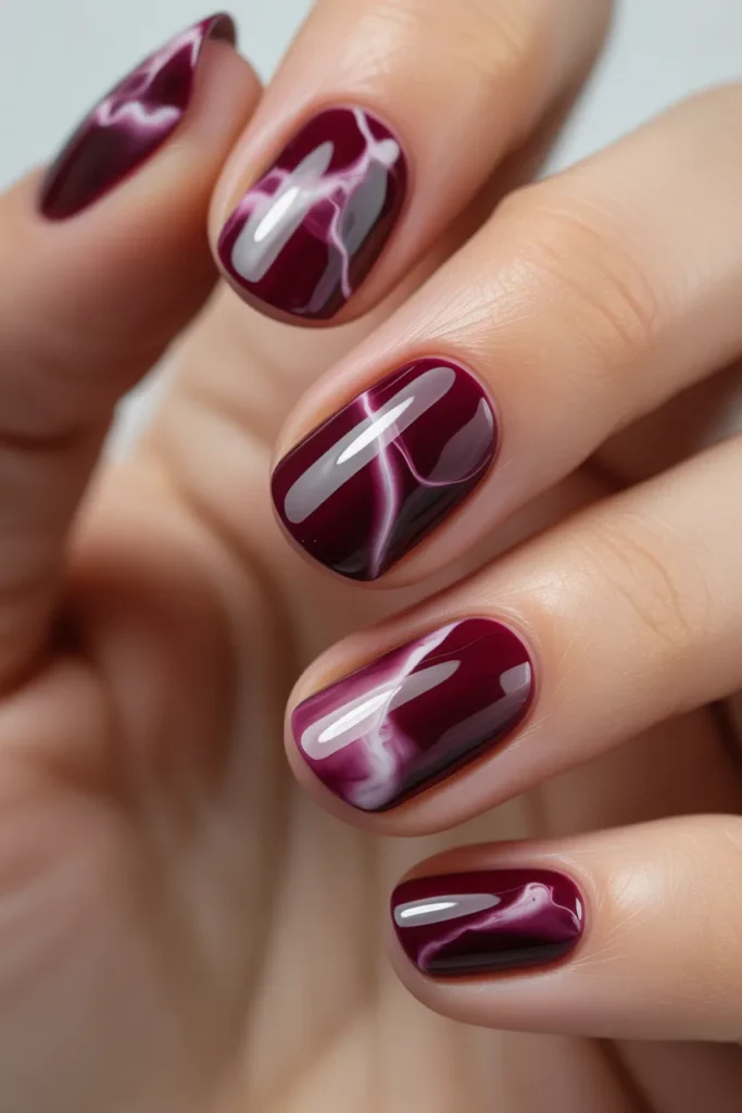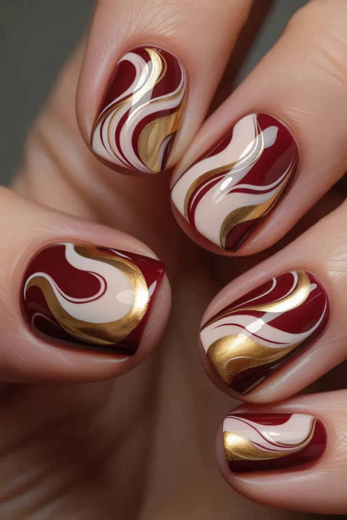 Abstract swirls in complementary colors over burgundy nails create a dynamic, artistic effect. Gold, white, or black accents add movement and depth to the design. This style is perfect for creative souls who want a manicure that doubles as wearable art.