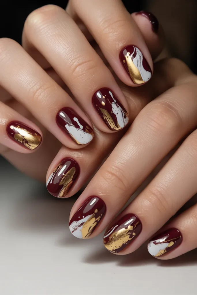 Add an artistic flair with paint splatter designs in white, gold, or complementary shades over burgundy nails. The abstract style makes each nail unique, offering a fun, creative, and edgy look. Ideal for art lovers or anyone looking for a bold statement.