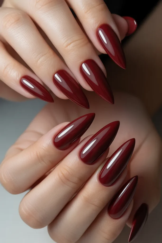 Long stiletto nails in glossy burgundy make a bold, glamorous statement. The dramatic shape combined with the rich color exudes confidence and style. Ideal for nights out, parties, or anyone looking to make a high-fashion impression.