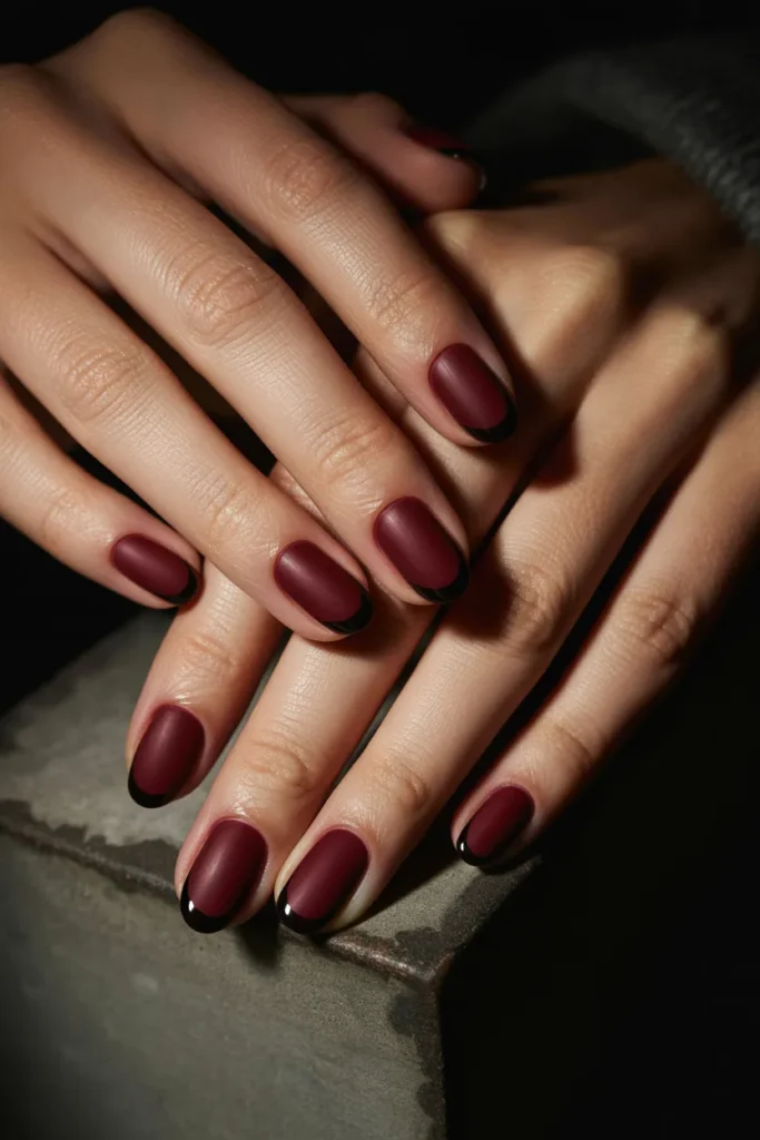 Combine matte burgundy nails with thin black tips for a chic, modern contrast. The deep colors create a bold, edgy aesthetic that’s perfect for evening events or stylish everyday wear. This design balances subtlety with a hint of drama.
