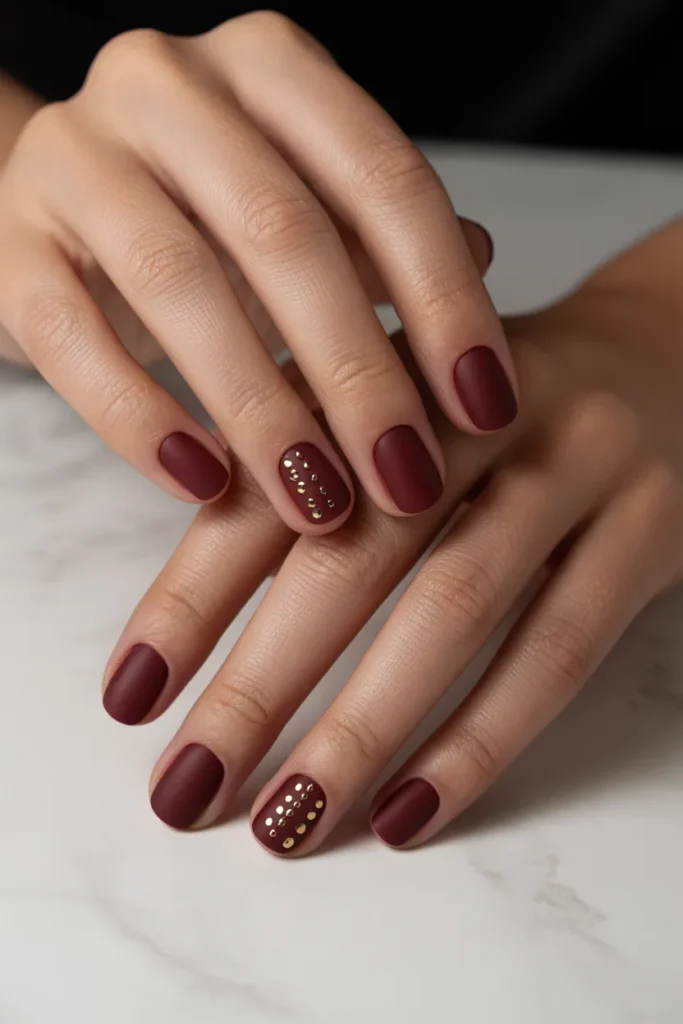 Minimalist matte burgundy nails accented with tiny gold dots for a chic, modern touch. The subtle sparkle of the dots contrasts with the matte finish, creating balance and elegance. Perfect for those who enjoy understated yet stylish designs.