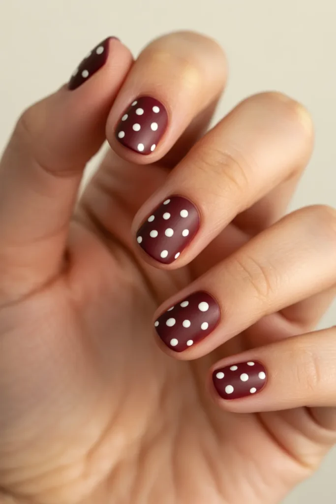 Minimalist dots on a matte burgundy base give a chic and stylish look. White or gold dots add a playful contrast while keeping the manicure sophisticated. Perfect for everyday wear or casual occasions, this design is simple yet visually striking.