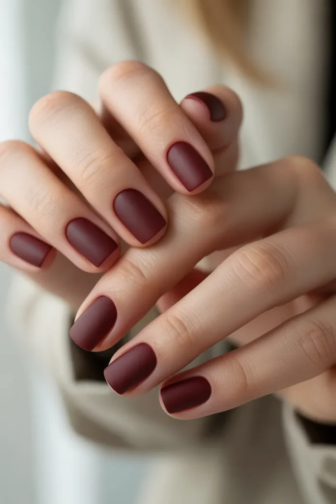 Matte burgundy nails offer a modern, velvety alternative to glossy finishes. The soft, non-reflective texture gives your nails a chic, understated elegance that feels both contemporary and classy. This minimalist look works for professional settings or stylish everyday wear, letting the rich color speak for itself.
