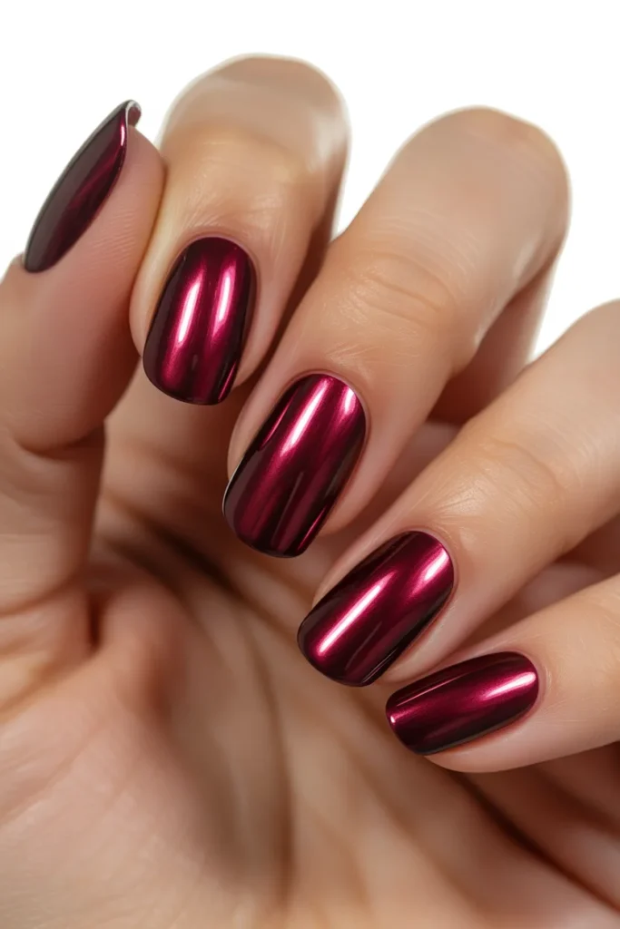 Chrome burgundy nails reflect light beautifully, giving a futuristic and bold finish. The metallic sheen makes your manicure eye-catching and modern. Ideal for those who love to stand out, this design combines elegance with a statement-making edge.