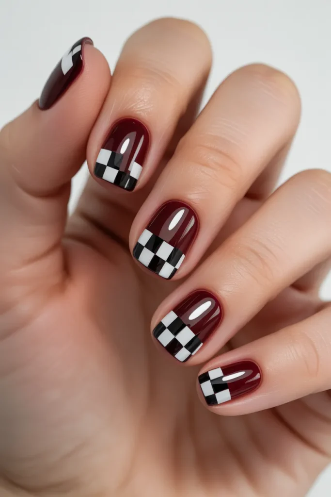 Graphic checkered patterns on a burgundy base are bold, playful, and trendy. Black or white checks create a striking contrast, making your manicure stand out. This design works well on square or almond nails and adds an edgy, fashion-forward vibe to your style.