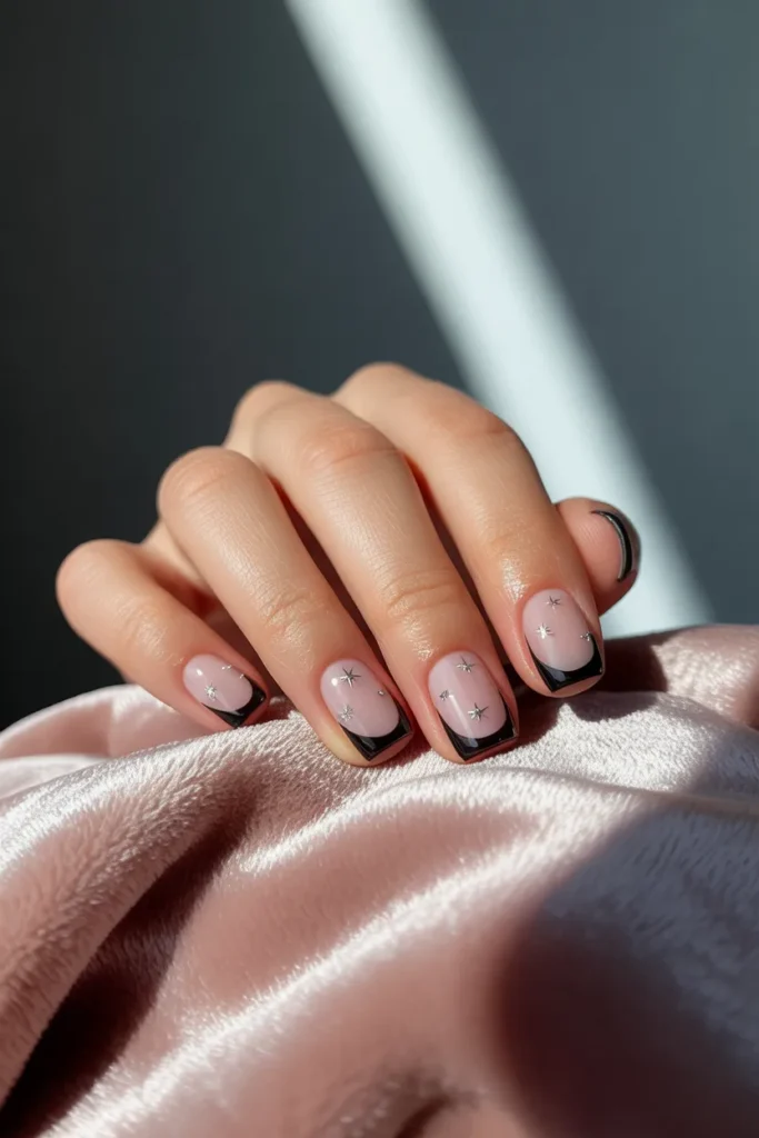 A magical twist on the classic French manicure, these nails feature black tips with tiny star or sparkle details. The design keeps things clean and classy while adding a hint of enchantment. It’s perfect for those who love subtle nail art with a unique edge. Simple, chic, and effortlessly witchy.