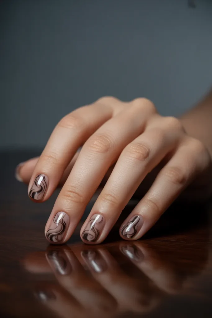 Magic smoke nails feature wispy, flowing patterns that resemble drifting smoke. Usually done on a clear or neutral base, the black or gray swirls create a light yet mysterious effect. This design feels modern, artistic, and slightly edgy. It’s perfect for a subtle witch-inspired look.