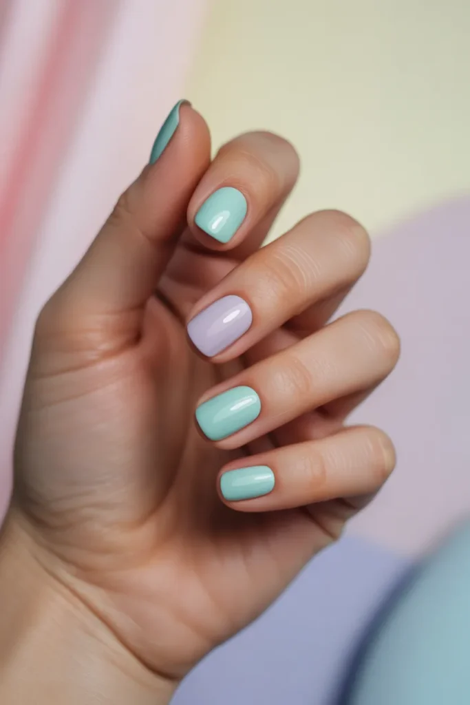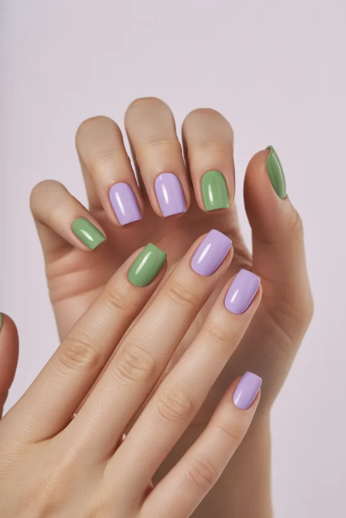 Alternate lavender and sage green nails for a chic pastel combo. This color pairing feels soft yet trendy. Great for everyday wear.