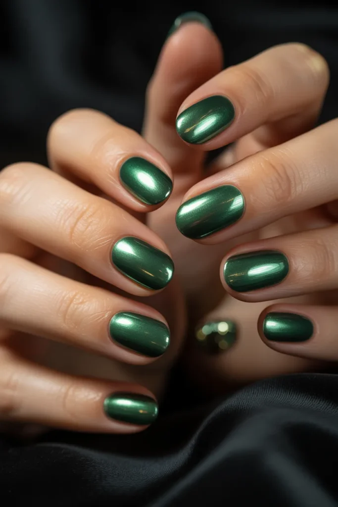 Apply chrome powder over dark green polish for mirror shine. Stunning party look.