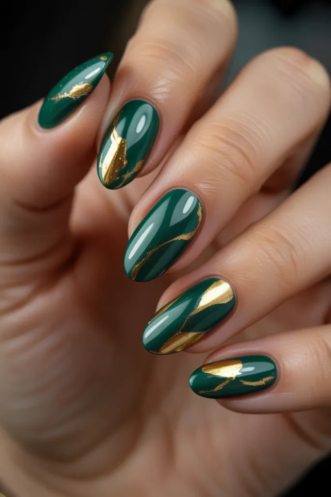 Paint nails dark green and add gold foil flakes to one accent nail. The metallic shine pops beautifully against deep green. Keep the foil placement random for a luxe effect.
